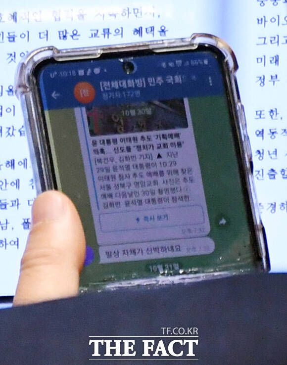 하지만 일부 의원은 민주당 의원 전체대화방에 공유된 윤 대통령의 이태원 참사 예배 관련 기사를 살펴보거나 자신의 SNS에 윤 대통령 관련 글을 올리기도 했다.