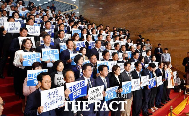 윤 대통령의 국회 시정연설이 예정된 이날 더불어민주당 의원들은 본청 로텐더홀에서 '국민을 두려워하라', '민생 경제 우선', '국정기조 전환', '민생이 우선이다' 등 피켓을 들고 윤 대통령 입장을 기다렸다.