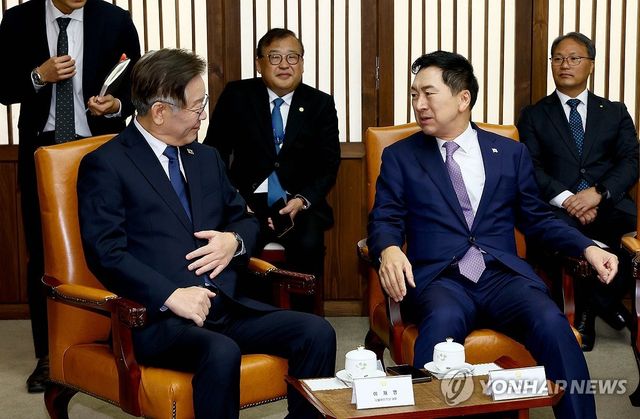 국민의힘 김기현 대표와 더불어민주당 이재명 대표가 31일 국회 의장실에서 윤석열 대통령과의 사전환담에 앞서 대화하고 있다. / 연합뉴스