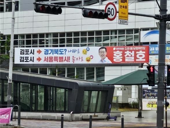 경기 김포시의 한 거리에 붙은 현수막에 '경기북도? 나빠요, 서울특별시 좋아요'라는 내용이 담겨 있다. / 연합뉴스-홍철호 국민의힘 김포을 당협위원장 제공