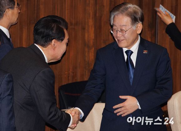반면 이 대표는 이날 윤 대통령 국회 본회의장 입장 직후 가장 먼저 악수를 나누는 모습을 보였다. 윤 대통령도 연설 후 야당 의원들을 찾아 악수를 청했으나 의원 일부는 거부하거나 마지못해하는 자세를 연출했다.