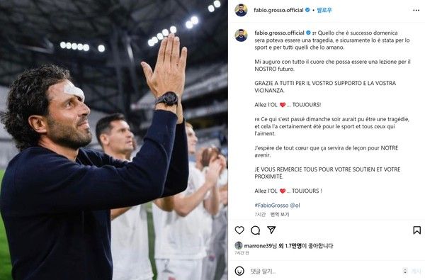 [풋볼리스트] 조효종 기자= 원정 경기를 치르기 위해 이동하던 중 공격을 받아 부상을 입은 파비오 그로소 올랭피크리옹 감독이 팬들에게 메시지를 전했다.