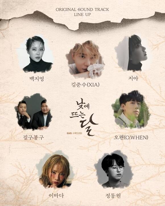 1일 ENA 새 수목드라마'낮에 뜨는 달'(극본 김혜원·정성은, 연출 표민수·박찬율) 제작진은 총 7팀의 OST 라인업을 공개했다. 이번 OST에는 가수 백지영과 김준수를 비롯해 지아 길구봉구 오왠 이바다 정동원이 참여한다.