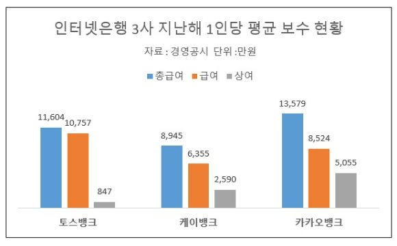 1일 은행들이 일제히 발표한 은행 경영현황 공개 보고서에 따르면 인터넷전문은행 3개 회사 중 카카오뱅크 임직원의 1인당 평균 보수(급여와 상여 등 합계 기준)는 1억3579만원으로 가장 많았다. 이어 토스뱅크가 1억1604만원, 케이뱅크 8945만원이었다.