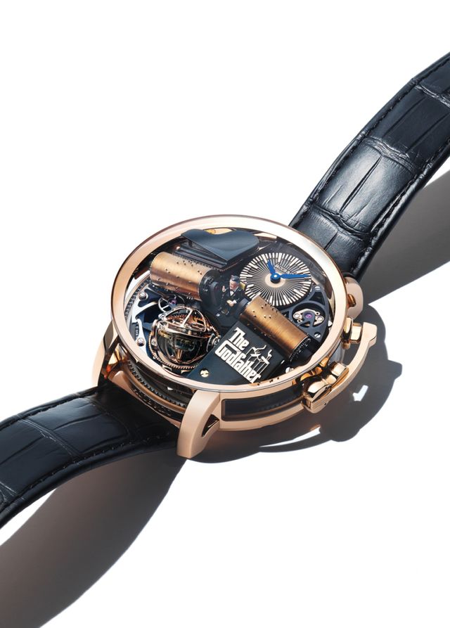 누구에게나 유년의 갈증을 채워준 것에 대한 기억 하나쯤 있을 테다. 우즈베키스탄 출신 미국 이민자이자 제이콥앤코 설립자인 제이콥 아라보 역시 “I believe in America”라는 대사로 영화 <대부>가 각인돼 있다. 그리고 그 울림은 ‘오페라 갓파더 뮤지컬 워치’의 시작점이 됐다. 오르골을 결합한 차이밍 메커니즘을 갖춘 시계로, 두 실린더의 정교한 맞물림을 따라 <대부>의 상징적 테마음이 울려 퍼진다. 다이얼 중앙에 자리한 대부의 모습과 그랜드피아노 등 눈길을 끄는 요소가 가득하지만, 트리플 액시스 그래비테이셔널 투르비용의 첨단 기술 역시 시계의 가치를 드높인다.