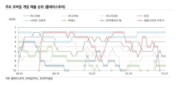 ‘리니지M’과 ‘나이트 크로우’는 매출 순위 1,2위 유지. ‘리니지W’는 전월 대비 소폭 상승, ‘리니지2M’은 하락. 전월 주요 신작 ‘세븐나이츠 키우기’는 출시 효과가 제거되며 매출 순위 5-10위권 기록.