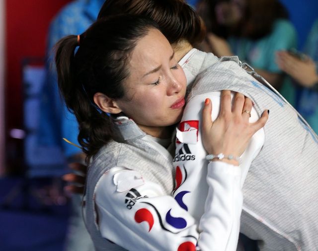 남현희가 2014년 9월 24일 경기도 고양체육관에서 열린 2014 인천 아시안게임 펜싱 여자 플뢰레 단체전 중국과 결승 경기에서 승리해 금메달을 획득한 후에 팀 동료 오하나와 감격의 눈물을 흘리고 있다. / 연합뉴스