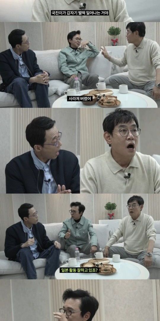 이경규는 “우리 유튜브 구독자들이 김국진을 제일 보고싶어 했다”라고 하자 김국진은 “경규 형과는 한 10년에 한 번 정도 통화하는데 경규 형이 얼른 끊는다. 그런데 요즘엔 유튜브 하면서 전화가 꽤 오더라”며 폭로했다.