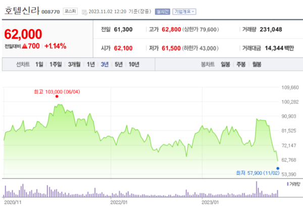 호텔신라의 3분기 매출액과 영업이익은 각각 1조 118억 원, 77억 원이었습니다. 매출액은 시장 기대치에 부합했습니다. 다만, 영업이익은 시장 기대치를 89%가량 밑돌았습니다. 이에 따라 실적 발표전 7만 원대에 머무르던 주가는 6만 원대 초반으로 내려앉았습니다.