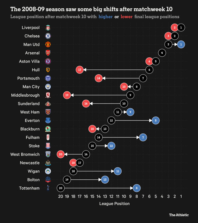 디애슬레틱이 공개한 자료에 따르면 20개팀 경쟁 체제로 돌입한 1995/96시즌 이후 10라운드 기준 순위표와 최종 리그 순위표를 비교해 봤을 때 38%의 팀이 한 단게만 이동했거나 같은 순위에 머무른 것으로 조사됐다.