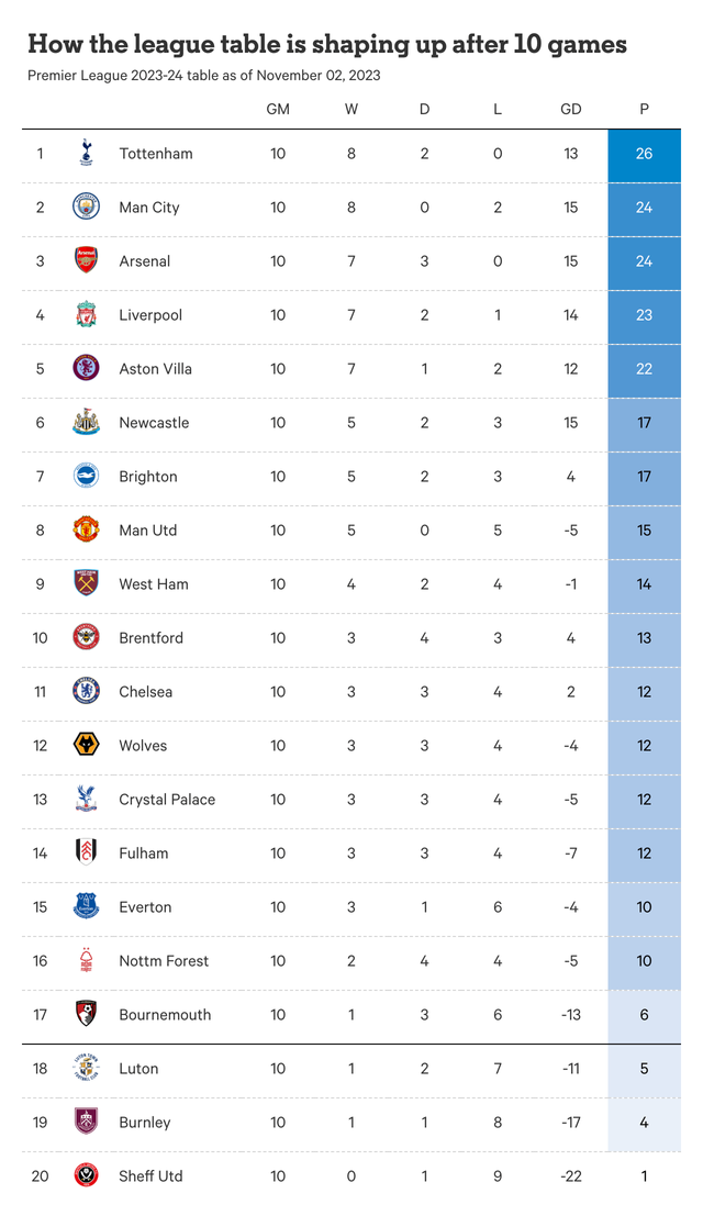글로벌 스포츠 매체 디애슬레틱은 2일(한국시간) "2023/24시즌 프리미어리그 순위표가 극적으로 변할 것 같지 않다. 이를 증명하는 통계가 있다"라면서 10라운드 기준 순위표와 최종 라운드 순위표가 큰 차이를 보이지 않을 거라고 예측했다.
