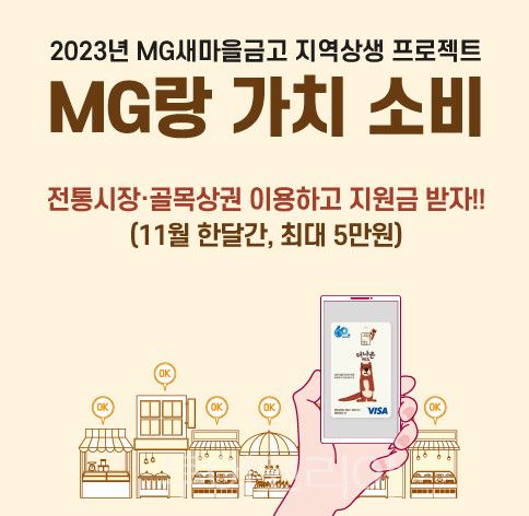 [투어코리아=유경훈 기자] MG새마을금고는 11월 한 달 간 2023년 지역상생 프로젝트 ''MG랑 가치 소비' 사업을 추진한다고 밝혔다.