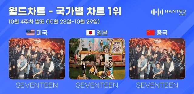 SEVENTEEN在10月第四周的Hanteo国家榜单(美国、日本和中国)中实现了全胜,再次证明了他们的全球人气。