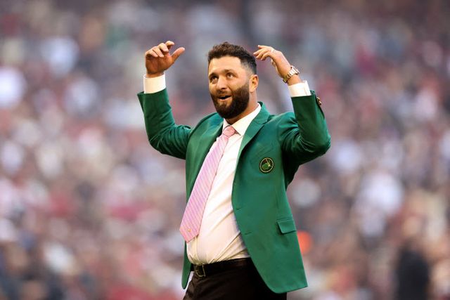 존 람이 지난 1일 애리조나와 텍사스의 메이저리그(MLB) 월드시리즈 4차전에서 마스터스 그린 재킷을 입고 시구한 모습.(사진=AFPBBNews)