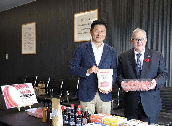 로렌스 맥콜레이 캐나다 농업농식품부 장관(오른쪽)과 최훈학 SSG닷컴 영업본부장이 '2023 쓱데이' 기간 선보일 캐나다 농특산물을 들어 보이고 있다. © SSG닷컴