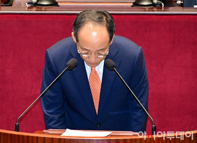 아시아투데이 이병화 기자 = 추경호 경제부총리 겸 기획재정부 장관이 3일 국회에서 열린 예산결산특별위원회 전체회의에서 2024년도 예산안 및 기금운용계획안 등에 대한 제안설명을 하기에 앞서 인사하고 있다.
