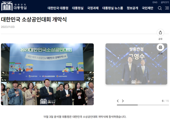 대통령은 이날 행사에 앞서 한국메이크업미용사회, 펫산업연합회 등이 운영하는 업종별 부스를 참관하고, 소상공인대회 기간 중 펼쳐질 소상공인 기능경진대회 결선 참가자들에게 좋은 결과를 얻으시라며 덕담을 건넸다.