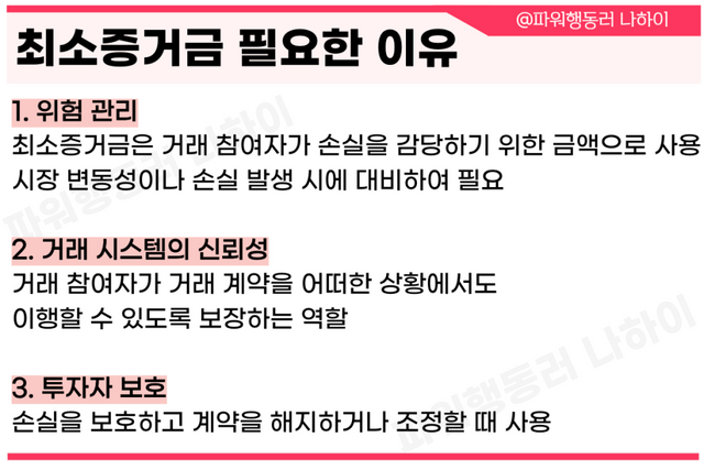 최소증거금은 거래 참여자가 손실을 감당하기 위한 금액으로 사용되며, 시장 변동성이나 손실 발생 시에 대비하여 필요합니다.