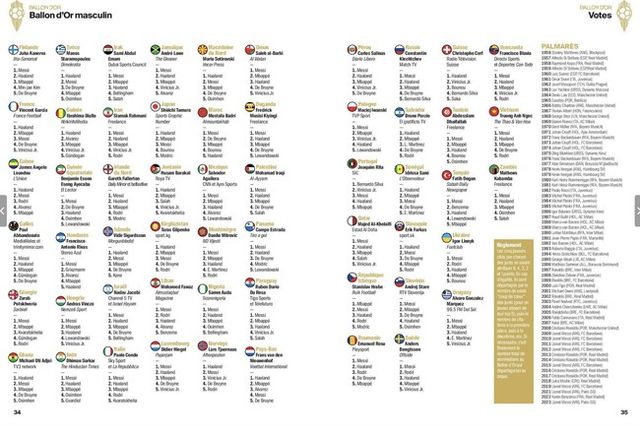 투표권을 가진 기자는 총 5명의 선수에게 투표할 수 있다. 각 기자는 5명을 순위에 따라 투표하는데 순위별로 배점되는 포인트가 다르다. 1위 선수는 6점, 2위 선수는 4점, 3위 선수는 3점, 4위는 2점 그리고 5위는 1점을 받는다. 이번 2023년 발롱도르 투표에 참가한 100명의 기자들의 투표 내역이 공개됐다.