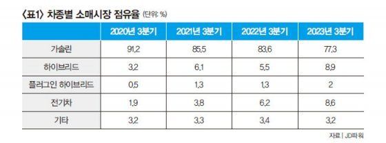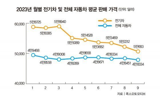 전기차 시장의 둔화 징후가 곳곳에서 나타나고 있다. 차량 판매 가격이 꾸준히 하락하는 동시에 소매 판매 점유율도 꺾인 것이다. 미국 시장조사업체 콕스오토모티브에 따르면 1월 5만8725달러(약 7880만 원)에 달하던 전기차 평균 판매 가격은 9월 5만683달러(약 6800만 원)까지 하락했다(그래프 참조). 고금리 장기화 여파로 경기둔화 징후가 나타나면서 소비자들이 고가형 전기차 구매를 피한 탓이다. 지난해 9월 전기차 평균 판매 가격이 6만5000달러(약 8730만 원)임을 고려할 때 1년 사이 전기차 평균 판매 가격은 22% 하락했다.