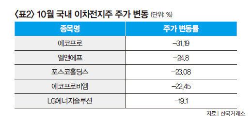 이차전지 대장주 에코프로는 9월과 10월 각각 주가가 28.32%, 31.19% 급락해 60만 원 선이 깨지기도 했다(표2 참조). 김현수 하나증권 연구원이 8월 3일 매도 리포트를 내며 제시한 목표주가 55만5000원을 목전에 둔 것이다. 포스코홀딩스와 LG에너지솔루션 등 한국 주요 이차전지 관련 기업도 10월 주가가 20% 전후로 하락했다. 주가 하락이 가장 큰 에코프로는 고점 대비 주가가 반토막 난 상황이다.