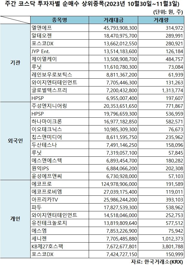 기관 '엘앤에프'·외인 '주성엔지니어링'·개인 '에코프로' 1위 [주간 코스닥 순매수- 10월30일~11월3일]