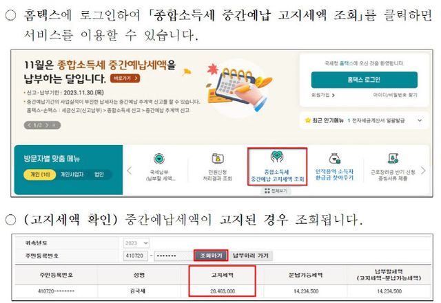 국세청 관계자는 “올해부터는 홈택스 로그인 후 ‘종합소득세 중간예납 고지세액 조회’를 누르면 고지세액, 분납가능세액 등 상세정보를 조회할 수 있으며, 전자납부도 가능하다”고 안내했다.