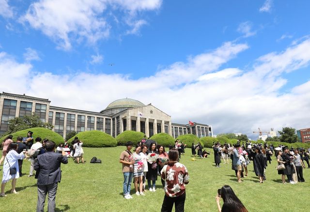 경북대 대구캠퍼스 본관 앞 잔디밭에서 기념사진을 찍는 사람들. / 뉴스1