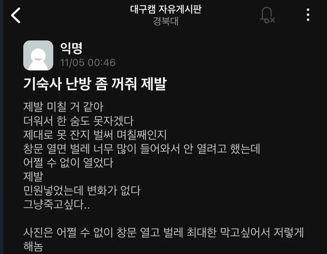 다른 기숙사생은 "창문 열면 모기랑 깔따구 들어오고 닫으면 쪄 죽고 이게 무슨 고문인가"라며 "무엇을 위한 난방인지 모르겠다. 이 정도면 자원 낭비 아니냐"고 핏대를 세웠다.