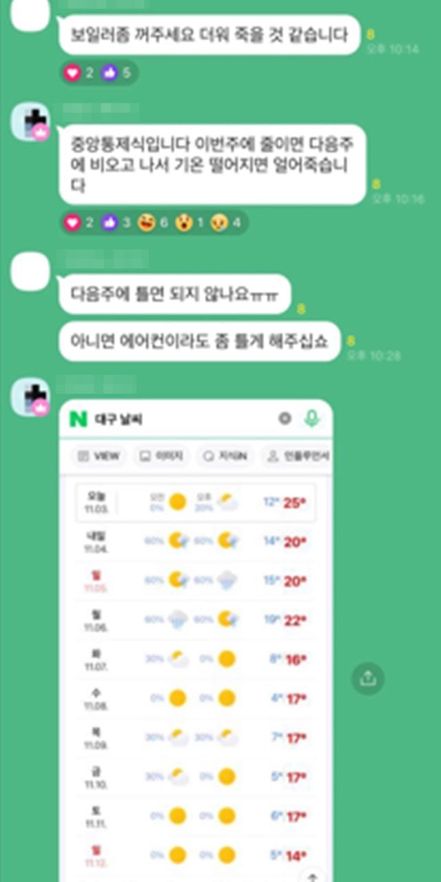 A씨가 "다음 주에 보일러 틀면 되지 않냐. 아니면 에어컨이라도 좀 틀게 해 달라"고 부탁했는데도 B씨는 "중앙통제식이라 유동적으로 운영하기 어렵다"는 답변을 되풀이했다. 그러면서 "때에 맞지 않는 고온 현상에 힘드신 점 통감하고 있다"며 "조금만 참아주시면 감사하겠다"고 협조를 당부했다.
