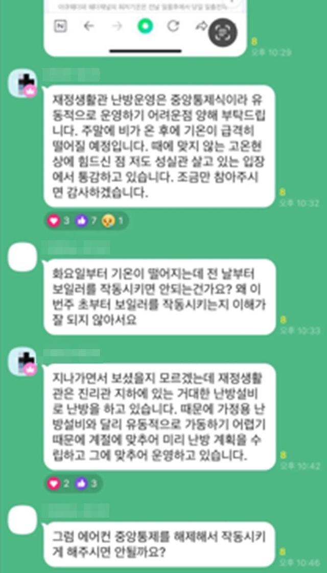 그러자 B씨는 "거대한 난방설비를 돌리는 기숙사는 가정용 난방설비와 달리 유동적으로 가동하기 어렵다"며 "계절에 맞춰 미리 난방 계획을 수립해 그에 맞게 운영하고 있다"는 원론적인 입장을 고수했다.