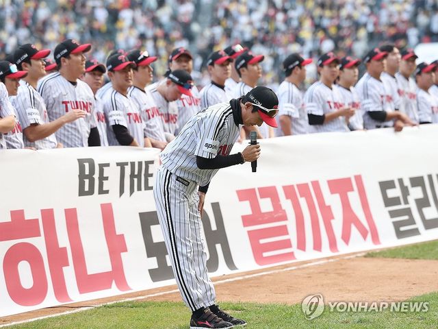 지난달 15일 서울 송파구 잠실야구장에서 열린 프로야구 두산과 LG의 경기를 마친 뒤 열린 LG트윈스 정규시즌 우승 트로피 전달식에서 염경엽 LG 감독이 팬들에게 감사 인사를 하기 전 고개 숙여 인사하고 있다. / 연합뉴스