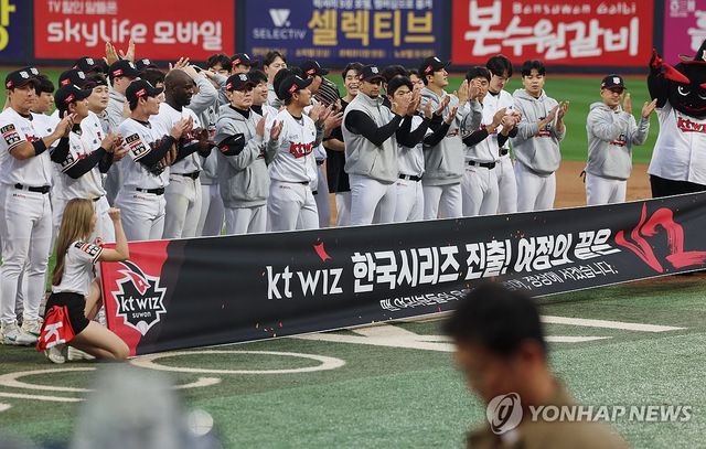 지난 5일 오후 경기도 수원케이티위즈파크에서 열린 2023 KBO리그 포스트시즌 플레이오프 5차전 NC 다이노스와 kt wiz의 경기에서 2-3으로 승리를 거둔 kt 선수들이 인사하고 있다. / 연합뉴스