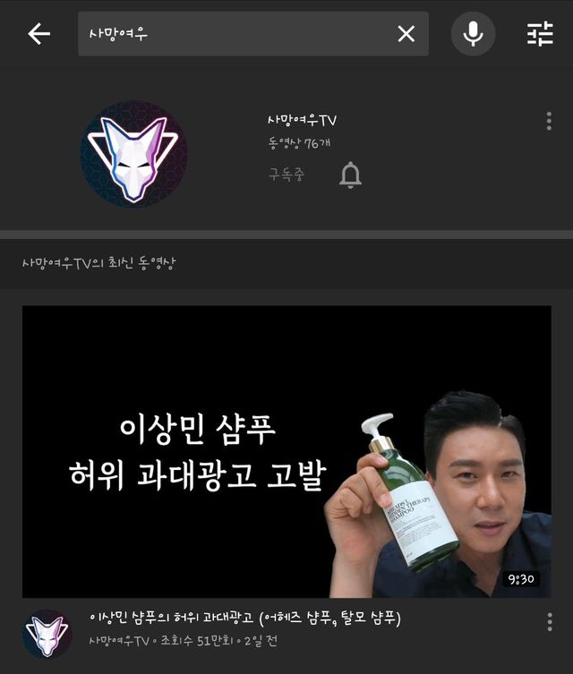 바로 제품 사기 저격 전문 유튜버 사망여우의 저격이 뜬 것입니다. 그는 허위 과장광고를 하는 제품을 저격해 소비자에게 올바른 소비 정보를 주는데요, 이번엔 이상민 씨가 선전하는 샴푸를 저격했다고 합니다.