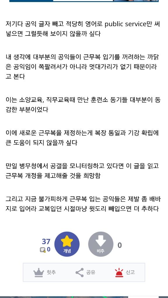 이를 본 누리꾼들은 "작은 의견이 큰 집단을 변화시킬 수 있다" "군복도 좀 바꿔줘라 기능성 1도없는데" "근데 너네들 꾸미는거 관심 없잖아;;" 등의 반응을 보였습니다.