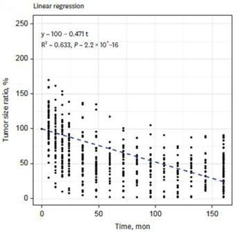 이번 연구 결과, 종양 부피는 10.4%(11명)에서 증가했고, 25.5%(27명)에서 유지됐으며, 64.2%(68명)에서 감소했다.