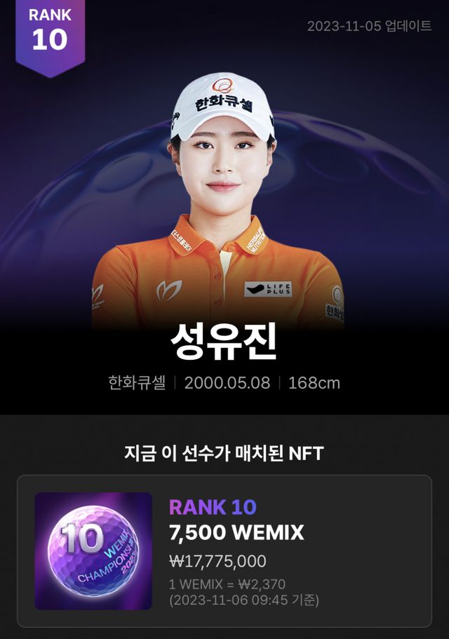 이번 대회 우승으로 성유진은 위믹스 포인트 랭킹이 7계단 상승해 톱10에 등극했다.