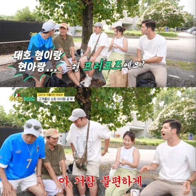 그러자 윤두준은 "대호 형과 현아가"라며 "프러포즈냐"라며 소리쳤다. 고규필은 "아 불편하게 나 왜 여기(김대호와 조현아 사이)에 앉게 했어. 내놔"라며 거들었다.