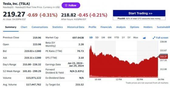테슬라 일일 주가추이 - 야후 파이낸스 갈무리