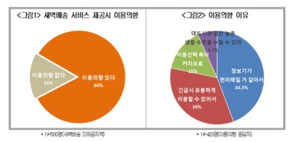 대한상의 관계자는 "일반배송과 달리 새벽배송이 제공해주는 편익이 크기 때문에 서비스 미제공 지역 소비자들의 이용 의향이 큰 것으로 분석된다"고 설명했다.