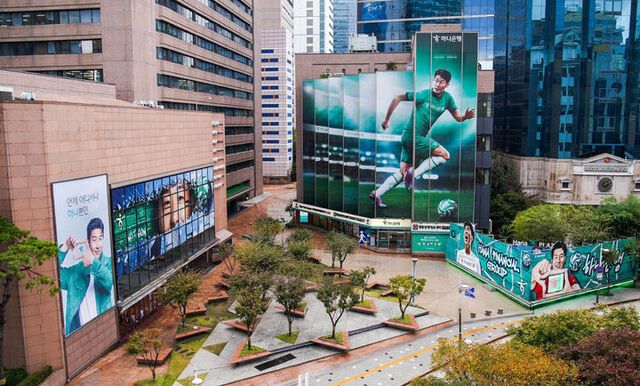 하나플레이파크에는 손흥민 선수의 △생동감 있는 모습이 담긴 대형 '그래피티 월' △드리블하며 질주하는 모습의 지상 7층 높이 '벽면 래핑' △국가대표 유니폼 전시 △그린 그라운드 라이팅 등 이색적이고 압도적 경관의 조형물들이 있다.