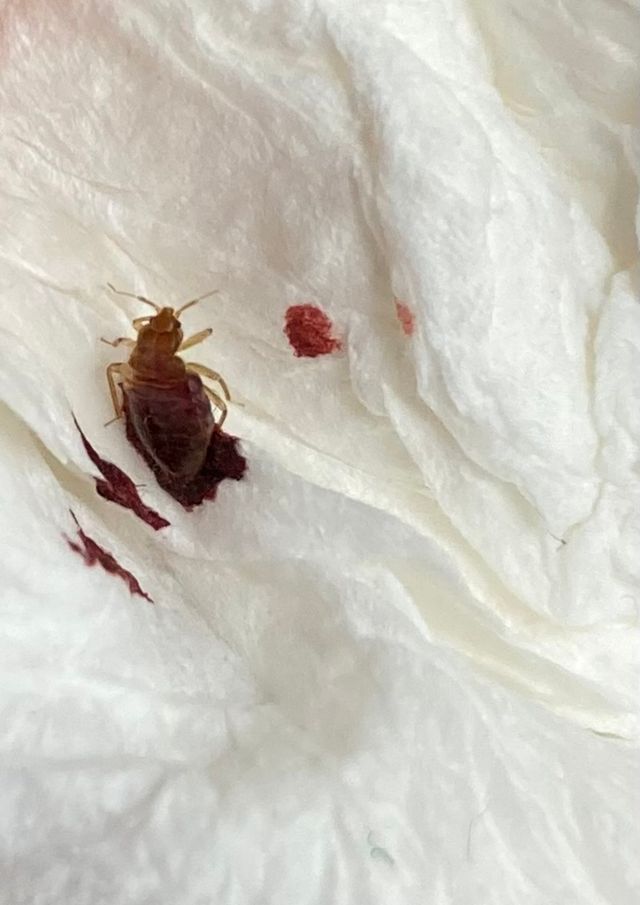 사진 속에는 피가 묻은 휴지와 빈대 한 마리가 담겨 있다.