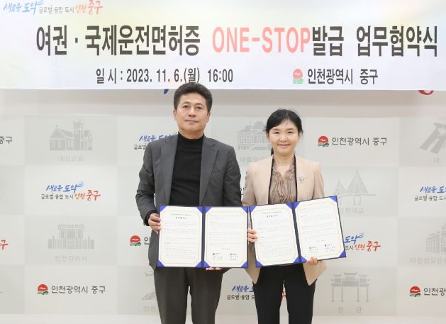 인천시 중구는 도로교통공단 인천 운전면허시험장과 6일 오후 중구청 구청장실에서 ‘여권·국제운전면허증 원스톱 발급을 위한 업무협약’을 체결했다.
