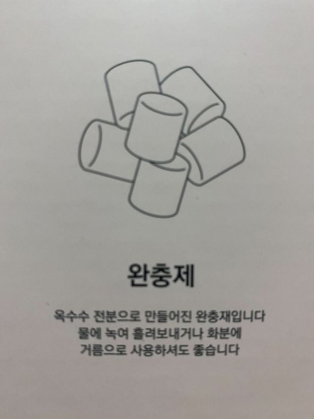 무려 옥수수 전분으로 만들어진 완충제, 물에 녹기도 하고 화분에 넣어 거름으로도 쓸 수 있다.