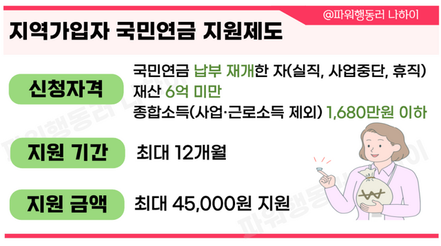 지역가입자 국민연금 보험료 지원제도는 국민연금 납부예외자가 납부재개 시, 생애 최대 12개월까지 국민연금 보험료 월 최대 45,000원을 지원해주는 제도입니다.