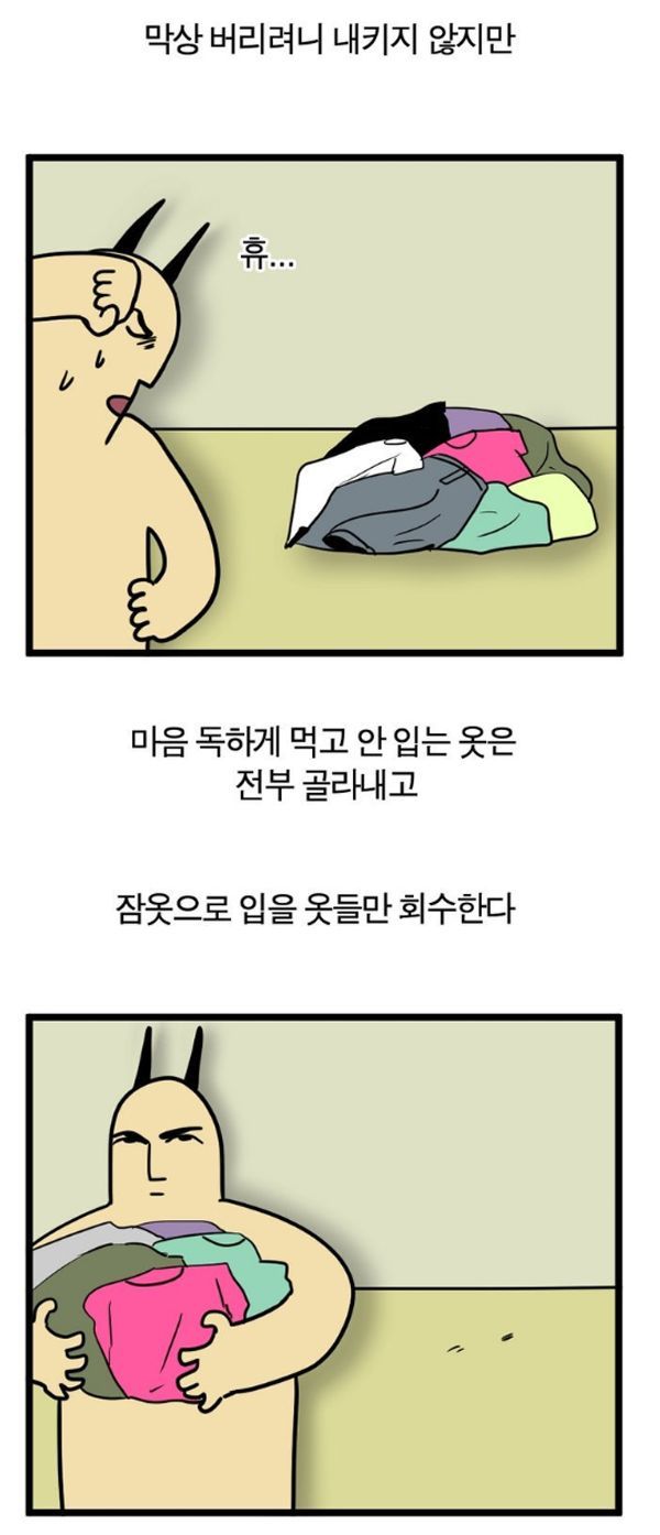옷은 아무리 사도 입을 옷이 없다. 그래서 그런지 옷을 자주 사게 되는데, 옷이 쌓이다보면 보관하는 것이 문제다. 옷 정리를 할때 모두가 공감가는 행동을 짧은 만화로 그린 트위터가 화제다. 함께 만화를 보면서 나도 그런건 아닌지 생각해보자.