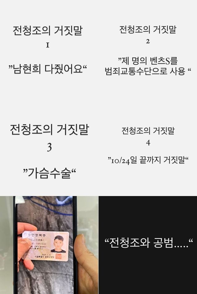 남현희는 주민등록번호 뒷자리가 1로 시작하는 전청조의 주민등록증 사진을 증거로 제시했다. 그는 "1로 시작하는 주민등록번호를 보여줬고 애정공세를 더 적극적으로 하며 다가왔다. 전청조의 삶을 존중해줘야겠다고 생각했다"고 설명했다.