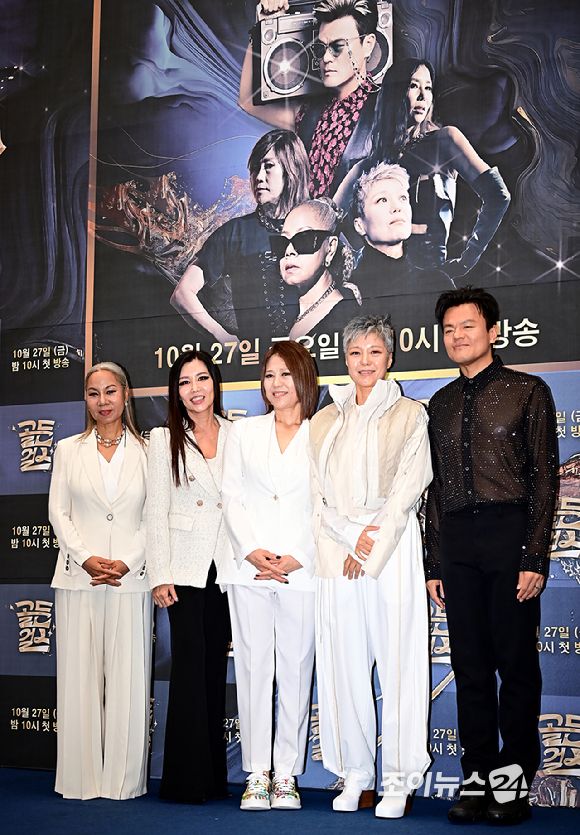 가수 인순이, 박미경, 신효범, 이은미, 박진영이 26일 오후 서울 여의도 KBS에서 열린 KBS 2TV '골든걸스' 제작발표회에서 포토타임을 갖고 있다. [사진=곽영래 기자]