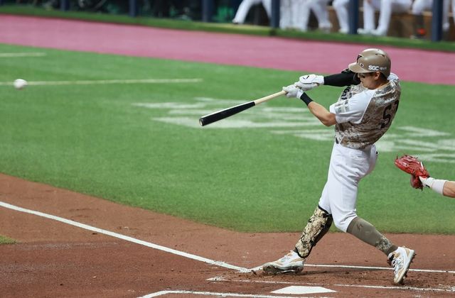 이정후가 지난 6월 8일 서울 고척스카이돔에서 열린 2023 프로야구 LG 트윈스와 키움 히어로즈의 경기에서 2타점 적시타를 치고 있다. / 연합뉴스