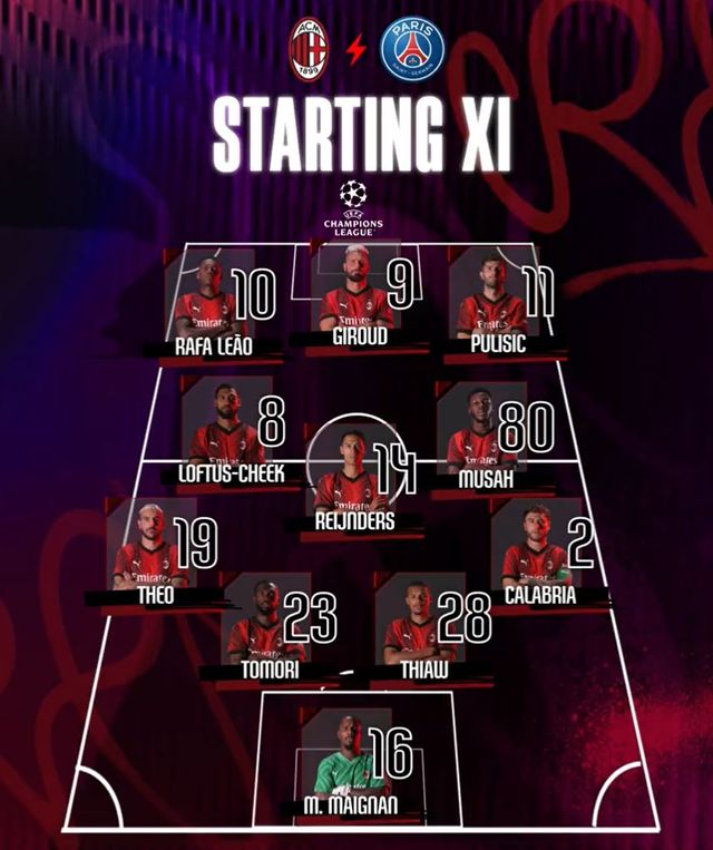 홈팀 밀란은 4-3-3을 꺼내들었다. 마이크 메냥이 골키퍼 장갑을 끼고, 테오 에르난데스, 피카요 토모리, 말릭 치아우, 다비드 칼라브리아가 수비를 구성했다. 티자니 레인더스, 유누스 무사, 루벤 로프터스-치크가 중원에서 호흡을 맞췄고, 하파엘 레앙, 올리비에 지루, 크리스천 풀리식이 득점을 노렸다.